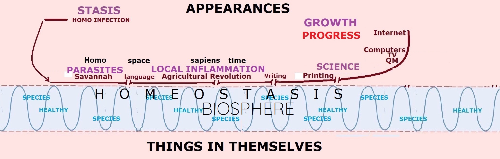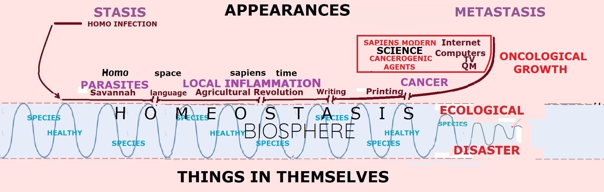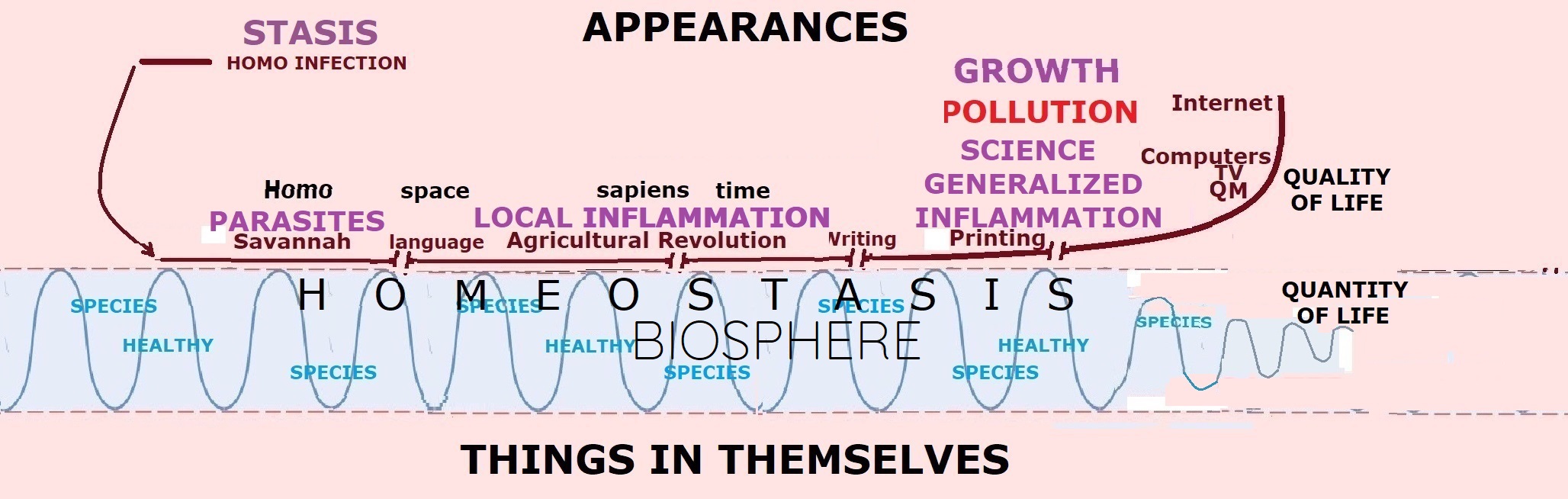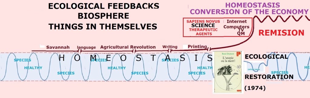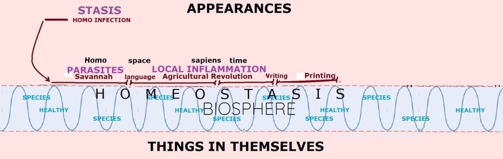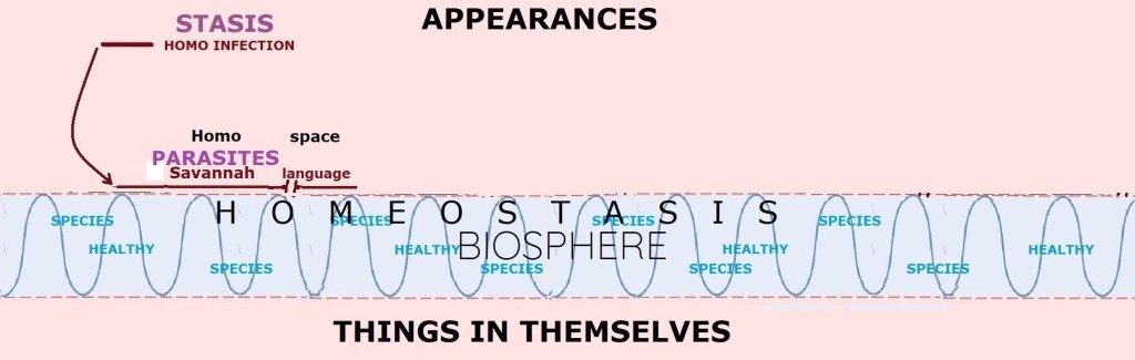 The important thing to see here is that by objectifying” our environment in space and time, we entered our own “stasis,” in that, we quit being an integrated part of life homeostasis as a new living entity while needing to openly communicate among us using language to remain such viable independent entities living in appearances. We thus became analogous “parasites,” not contributing to the homeostasis of the Biosphere on which we stood while still living off it like microorganisms do on our skin.