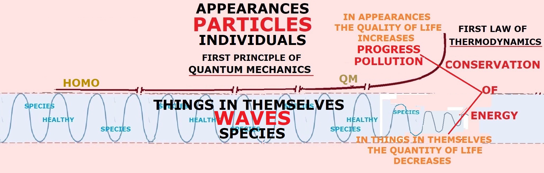 As you can see in the last figure, we need to unify both levels of reality in quantum terms since all reality is 100% composed of elementary particles, and quantum mechanics is the domain of science studying them. And it has done very well for itself. Its only limitation is that it is still working on the wrong premise that the things in themselves cannot be measured. As I have shown in this figure that they can: We know about the number of species that we have irradicated in the past and that we will in the future if we do not find ways to replenish the Earth collectively. We could also compare the amount of living time that humanity has gained in life expectation to the same amount living time lost by the species we have irradicated in this process of bettering our quality of life and increasing its expectation. It should be the same because the biosphere is a zero-sum living phenomenon.