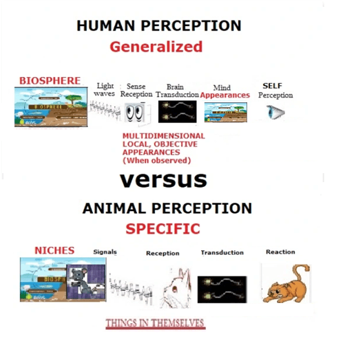Our minds do not react to the signals sent by the things themselves present in our living environment, to which all other living entities respond instinctively. Our minds, being self-conscious, are only aware of image representations that our brain creates from this data after they have been “transduced” by our sense organs. And, without the support of a society nurturing us after birth, we wouldn’t know what to do with them.